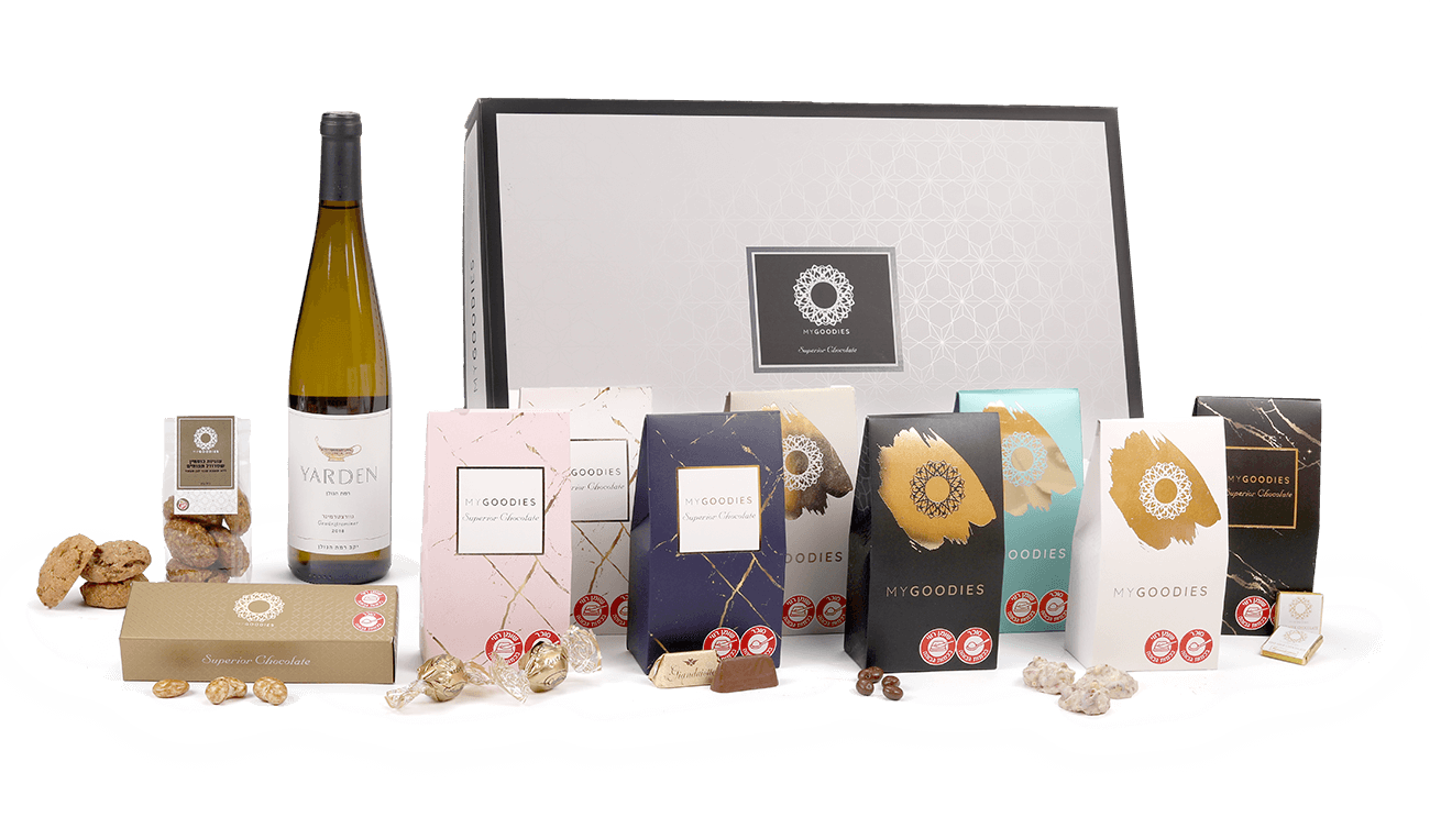 מארז שי גלקסי שחור – יין לבן גוורץ חצי יבש ומבחר פרלינים ושוקולדים