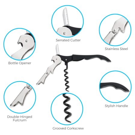 הפותחן מגיע עם ידית מתכת איכותית וחזקה בצבע שחור יוקרתי, וכולל בתוכו חולץ פקקי שעם, סכין קטנה וכן פותחן לבקבוקי בירה.