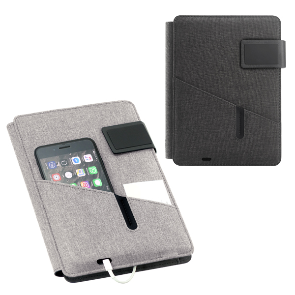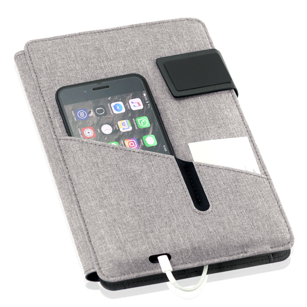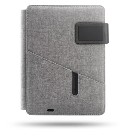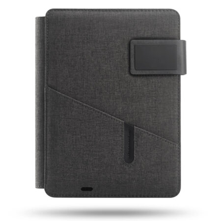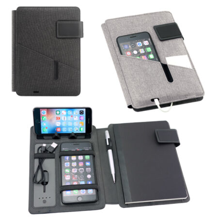 מכתביית A5 מאריג איכותי עם מחברת דפי שורה ומטען נייד פאוורבנק מובנה