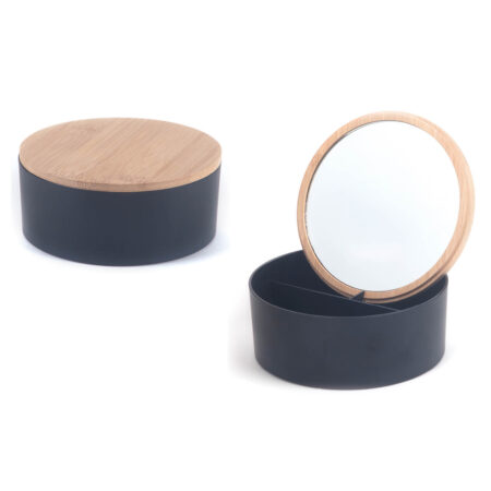 קופסת תכשיטים יוקרתית עם מכסה במבוק ומראה עגולה